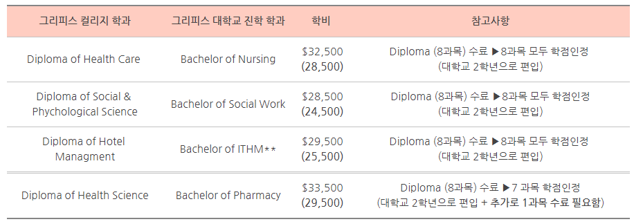 호주 그리피스 간호학과(Nursing) / 사회복지 학과 (Social Work) / 호텔경영 학과 (Hotel Managment) / 그리피스 약대 (Pharmacy)