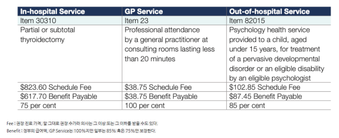 MBS는 Medicare Benefits Schedule의 약자로 호주는 행위에 따른 권장 수가를 명시했는데, 그 행위를 의사 전문성과 진료 등급(깊이 혹은 시간)에 따라 차등을 두고 있습니다.
